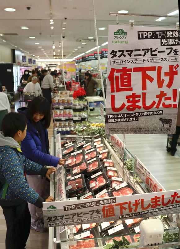 Japan's tariff on imported beef was slashed from 38.5 percent to 27.5 percent when the TPP came into force, and this will be lowered to 9 percent in the 16th year. The tariff on imported Australian beef had already been lowered to 29.3 percent for chilled beef under the Japan-Australia economic partnership agreement, but an Aeon official said the campaign aimed to boost sales of the meat.
