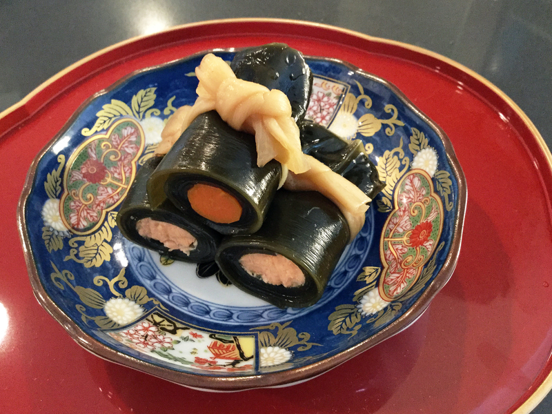 Osechi consists of a variety of dishes, each imbued with meaning for the coming year. Kobu-maki is an important dish that is believed to bring happiness and good luck in the New Year -- "kobu" comes from the word "yorokobu" (to be happy).