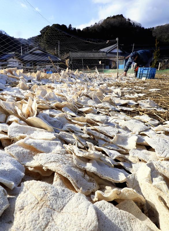 A farmer collects shimi-konnyaku (frozen konnyaku) in Hitachiota, Ibaraki Prefecture. To make it, slices of konnyaku -- which is a jellylike food made from konjak potato -- are placed on straw spread over a field, then left to freeze at night and thaw during the day for a month. They gradually dry out, becoming ready for collection when white. Farmers produce shimi-konnyaku during their off-season, often using the fields where they grow rice. Shimi-konnyaku is not only used in dishes such as nishime stew but also as a skin-friendly facial cleansing sponge.