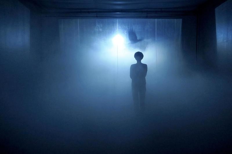 In the exhibition, her new fog sculptures are being exhibited -- one indoors and the other outdoors. "Fuga" is a work that creates artificial fog for 6 minutes in a closed exhibition room measuring about 7 meters by about 15 meters. Flying crows are projected on a thin curtain that separates the mist-spraying device and viewers. Nakaya says that crows are subject to extermination due to human egoism.