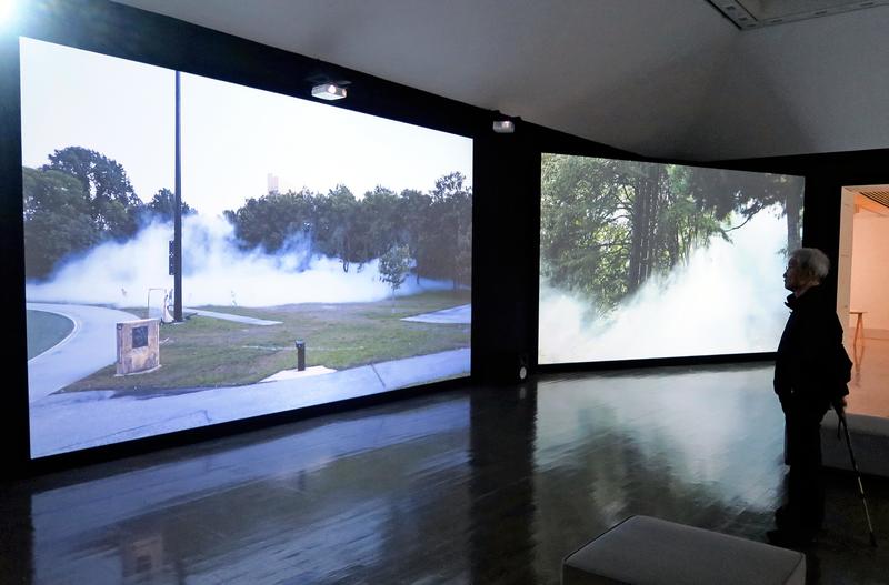 In her current solo exhibition, many spaces have been used for her fog sculptures, which she is synonymous with. Meanwhile, videos of past works are shown on a large screen. There are also blueprints, letters and other materials that give a behind-the-scenes look into the production of her works, which people can enjoy safely even in fog, such as how a mist-spraying device was developed based on the idea of spraying "drinking water" without using solvents and simulations to check how the fog moves.
