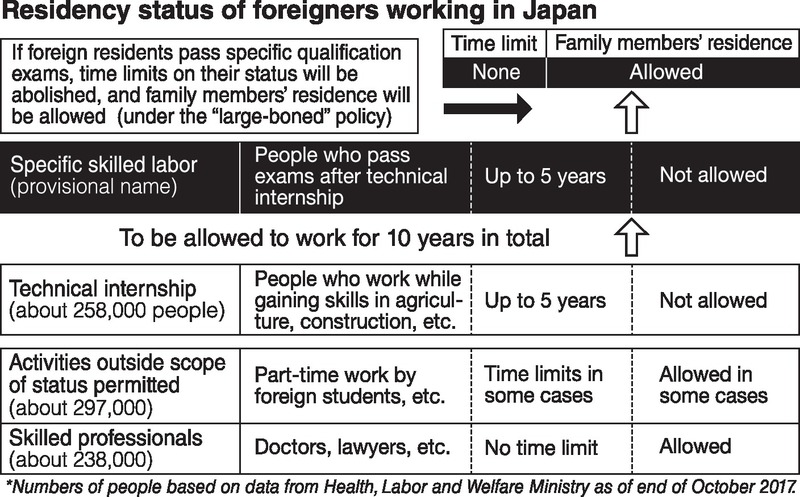 In this category, foreigners who have finished technical internship programs, which last for up to five years, will be allowed to work for another five years in Japan.