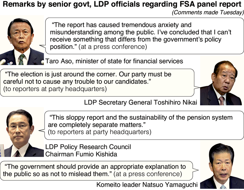 The government and ruling parties are struggling to calm the furor over a report stating that an elderly couple will need savings of 20 million yen (184,000 dollars) in addition to their pension benefits in order to cover their living expenses after retirement.