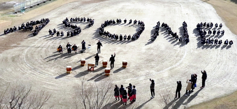 In the video, shooting for which took place Friday, 233 students from Miichuo High School in Kurume, Fukuoka Prefecture, stood on the school ground and formed letters for "AS ONE," while students from a music club were playing the theme song from the movie "Stand By Me." Students from a taiko Japanese drum club contributed a dynamic performance.
