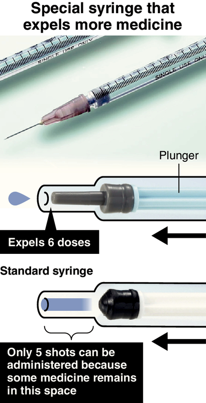 A standard syringe has a space near the tip, and some medicine remains in the space every time a shot is given. The remaining medicine needs to be discarded, and so only five doses can be obtained from each vial with standard syringes.