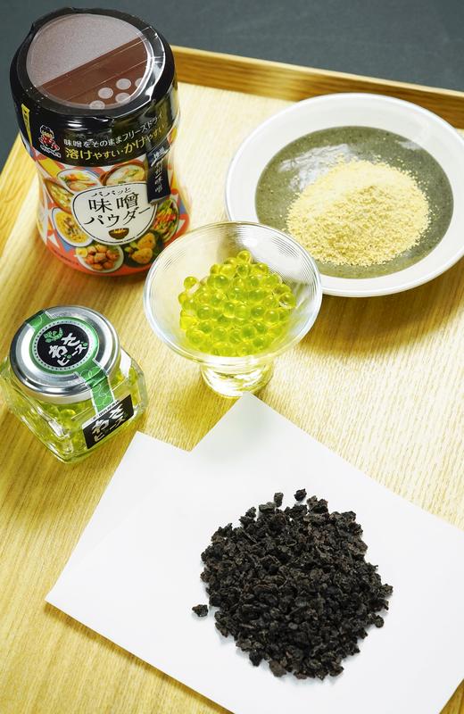 OSAKA -- Bead-shaped wasabi. Umeboshi flakes.