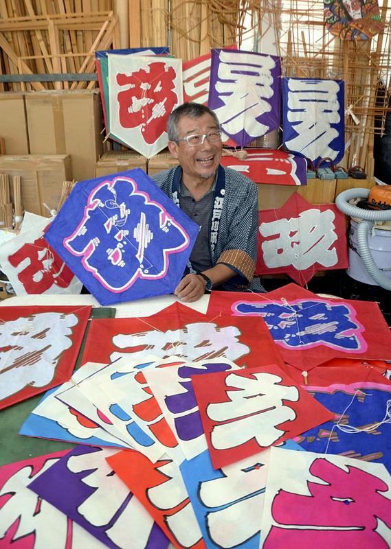 With the approach of the traditional kite-flying season for the New Year, real estate broker and kite enthusiast Ichiro Kabakura displays kites painted with the character for "boar," next year's animal in the Chinese zodiac calendar. For the past 30 years or so, Kabakura, 70, who lives and works in Edogawa Ward, Tokyo, has been holding kite-making workshops, teaching almost 3,000 children every year. This winter, he will hold workshops in 10 elementary schools in Edogawa Ward.