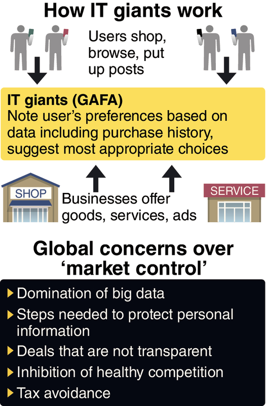 The report urged the strengthening of regulations on IT giants, called platformers in Japanese, which operate or host search engines, online shopping sites and social media sites, among other things. The panel has in mind Google, Apple, Facebook and Amazon.com, which are collectively called GAFA and are all based in the United States.