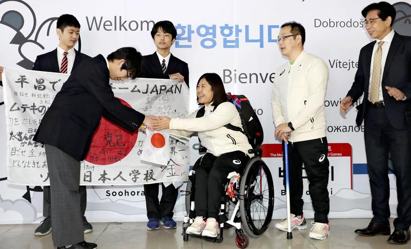 Members of Japan's Paralympic team arrived in South Korea on Saturday to participate in the Pyeongchang Winter Paralympic Games that will open on Friday. Sixteen para ice hockey players as well as coaches and officials left Japan earlier on the day, with athletes competing in other sports set to leave later.