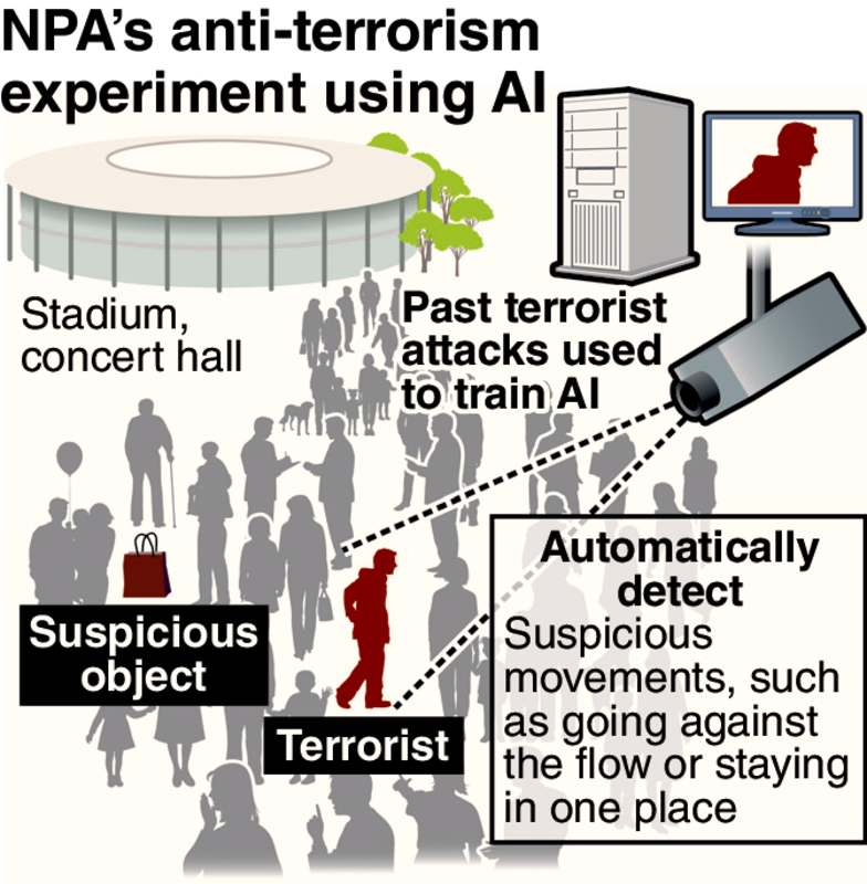 At large sports competitions, events and international conferences, surveillance cameras and other equipment would be installed temporarily to prevent terrorist attacks. The experiment would involve testing a system that uses AI to automatically detect suspicious people and objects from surveillance videos and other data.