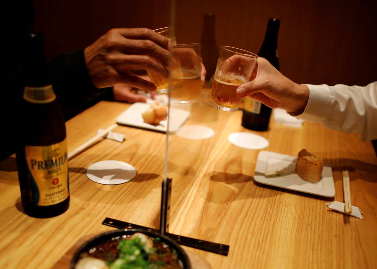 Customers toast beers across plastic transparent board on a table installed as a measure to prevent an infection with the coronavirus disease (COVID-19) at Kichiri Shinjuku, a Japanese style pub known as an 'izakaya', in Tokyo, Japan May 19, 2020. REUTERS/Issei Kato