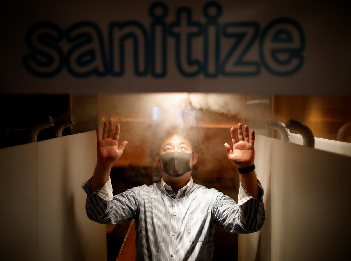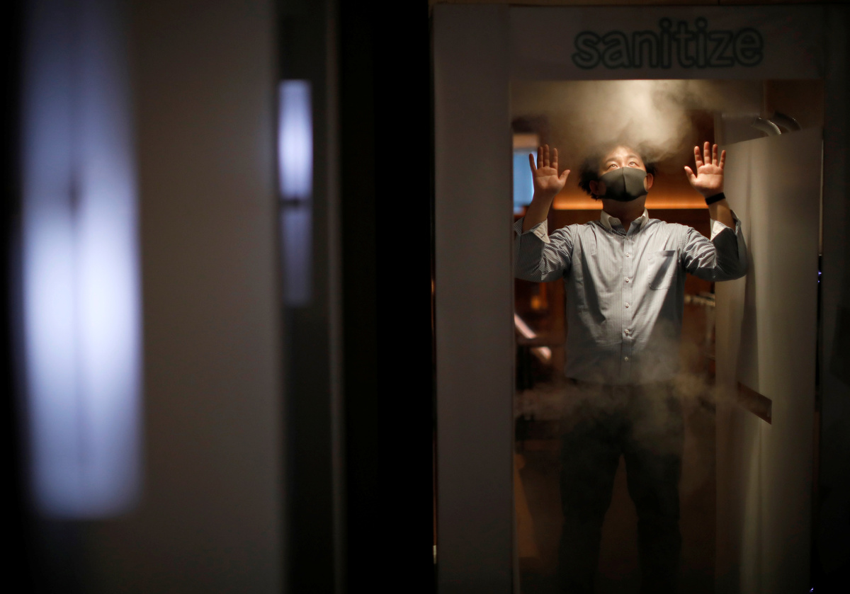They then step into a machine that looks like an airport security scanner, or a car-wash for humans, to get sprayed with a fine mist of the chlorine-based disinfectant for 30 seconds.