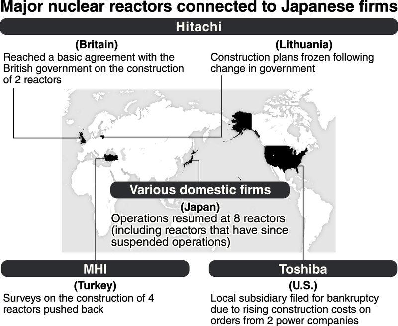 Toshiba Corp. has withdrawn from a project to construct nuclear reactors overseas, and Mitsubishi Heavy Industries, Ltd. also is having a difficult time in the field. These struggles stem from snowballing costs and delays in putting reactors into operation due to beefed-up safety measures.