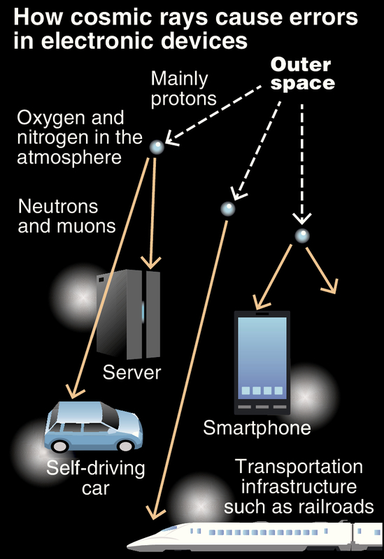 When things like neutrons and muons come into contact with parts of computers, unexpected electricity is transmitted, leading to malfunctions called "soft errors," in which systems do not work as designed.