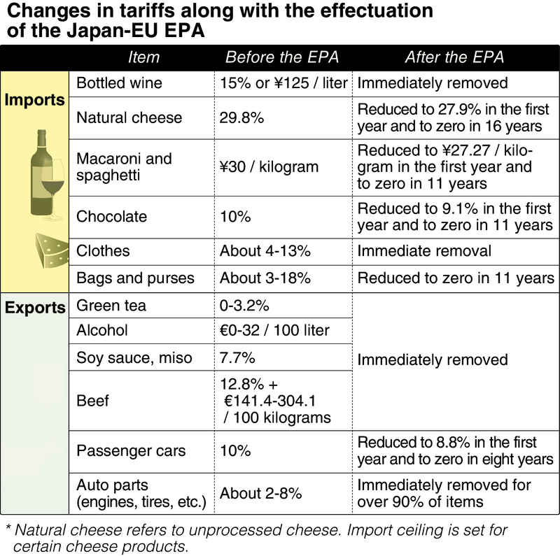 Japanese consumers stand to benefit from the Japan-EU economic partnership agreement (EPA) that went into effect Friday, with prices for such European products as wine and cheese set to fall.