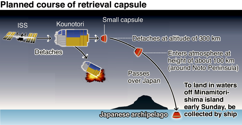 The capsule is to be detached from the Kounotori 7 at an altitude of about 300 kilometers, and enter the atmosphere at a height of about 100 kilometers over the Noto Peninsula. The Kounotori will burn up in the atmosphere.