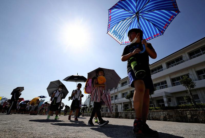 At Dojiyama elementary school in Toyota, Aichi Prefecture, a program that acts as a countermeasure for both the novel coronavirus and heat stroke by encouraging students to walk home under an open umbrella every day was started on May 27, the day that classes restarted. The umbrellas not only block out the sunlight, but also maintains enough space between each student so that they can remove their masks if they wish. As I stood there, wearing a hat and mask and dripping with sweat, I envied the children standing beneath the shade provided by their umbrellas.