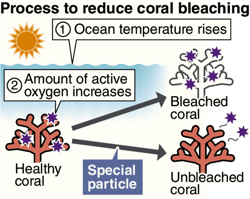 In their research, the team focused on an active oxygen-absorbing particle that was developed for medical use. When corals were put in a tank with seawater at a temperature of 33 C and no special action was taken, all the coral cells were dead within 10 days. However, when a particle compound was added to the water, the proportion of dead coral cells dropped by about 40 percent.