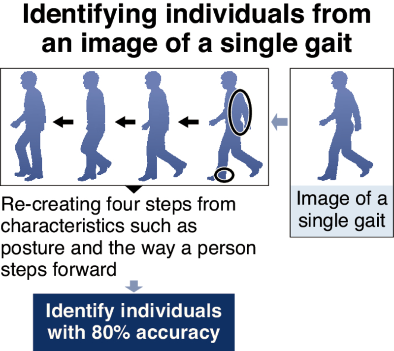 The team used data from videos of about 5,000 people walking, which was collected for experimental purposes, and analyzed it with deep learning -- machine learning algorithms that detect patterns from large amounts of data. It succeeded in extrapolating four steps of walking data from a single gait image by finding such characteristics as the way a person steps forward and their posture. The team said it could identify individuals with 80% accuracy based on this extrapolation.
