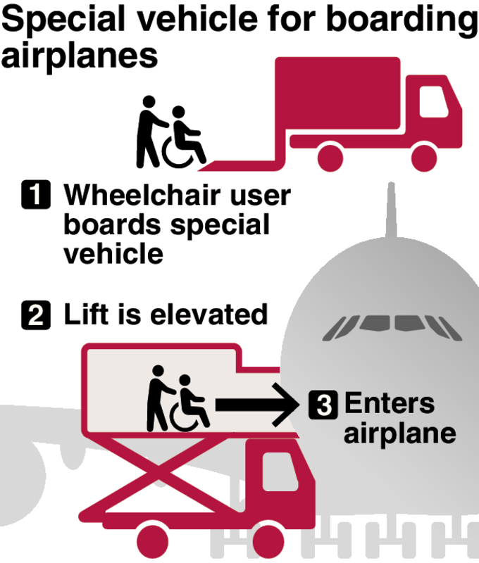 The Land, Infrastructure, Transport and Tourism Ministry will ask airport operators to introduce various new features, including special vehicles equipped with a lift to help wheelchair users board airplanes, and special lights at restrooms to alert the hearing impaired of emergencies when they are using such facilities.