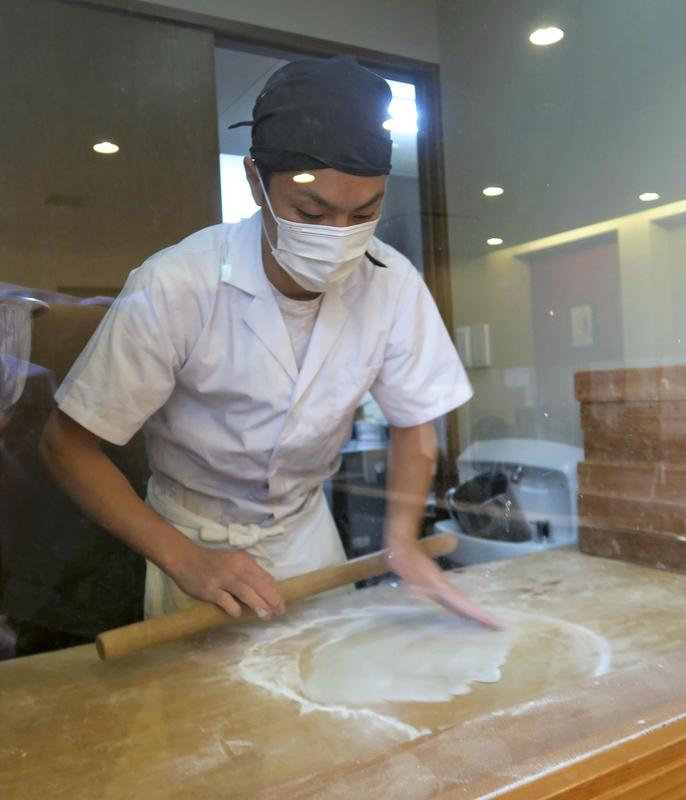 An employee of H.I.S. is seen making soba noodles at a restaurant in Kawagoe, Saitama Prefecture, on Oct. 28.
