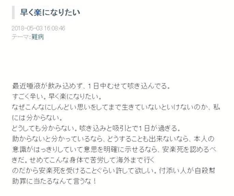 The woman created the blog in May 2018, according to people related to the case. At around the same time, she created a Twitter account where she posted messages such as, "My aim is to be euthanized," and "I hope the record of my struggles will be of use to other patients who want the same thing as I do."