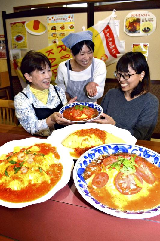 The cafe offers three kinds of omuraisu, including a spicy type with a Chinese twist. However, the signature dish has a generous topping of slices of what are called sugar tomatoes, a specialty in the village.
