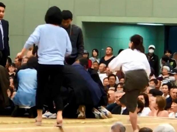 Women who attempted to save a man’s life when he suffered a stroke in a sumo ring in Japan were ordered from the ring as they were considered “ritually unclean”.