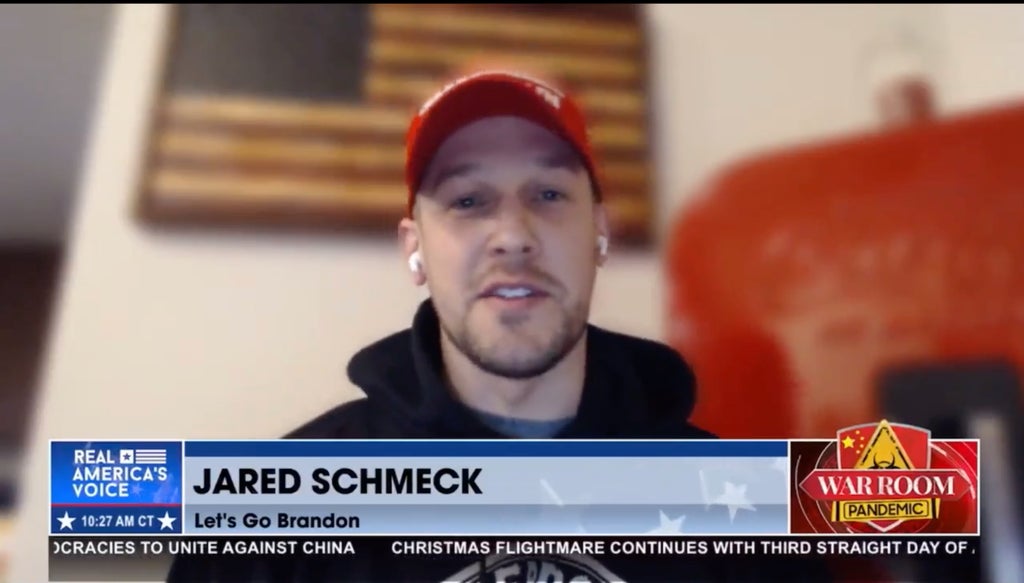 This generosity had apparently vanished a few days later when Mr Schmeck appeared on The War Room, hosted by far-right agitator and former Trump associate Steve Bannon. Sporting a red Make America Great Again hat, he stated bluntly that “Donald Trump is my president and he should still be president right now. The election was 10 per cent stolen. So, I just want to make that clear.”