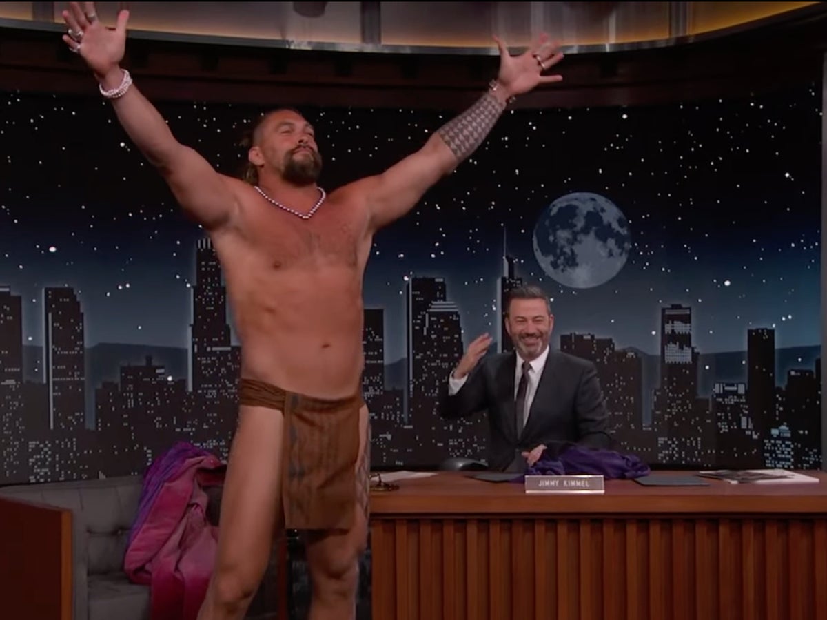 Confirming that he was even wearing it during the interview, Momoa proceeded to strip off as Kimmel’s band played seductive music.