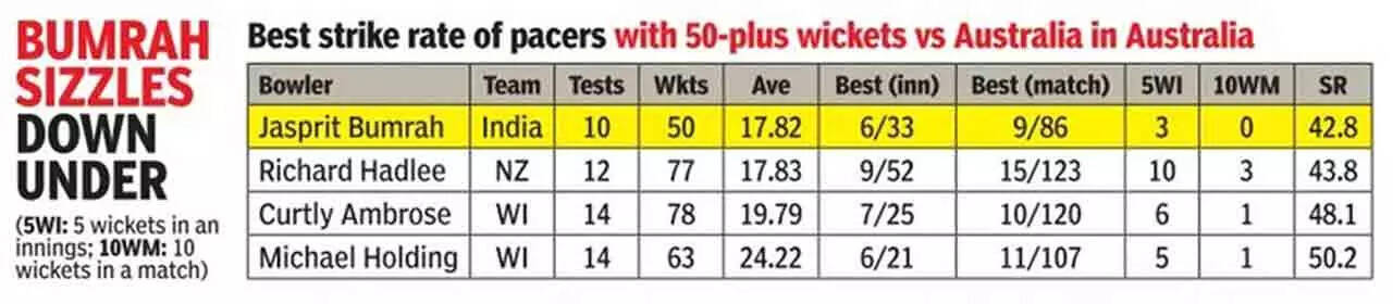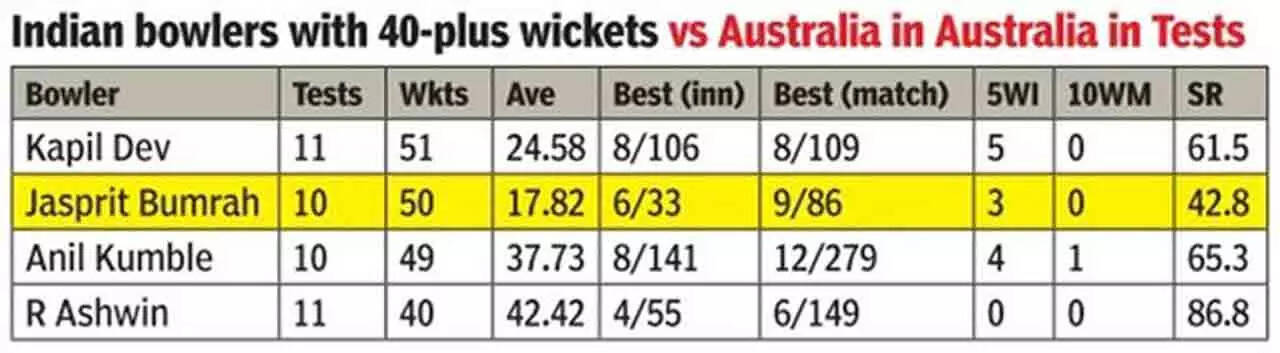 Bumrah has been head and shoulders above the rest of India's pace lineup on this tour and is currently the leading wicket-taker across both teams, with 18 wickets from five innings at an average of 11.72 and strike rate of 27.33. Mitchell Starc, with 13 scalps, is a distant second, while the next best Indian pacer is Mohammed Siraj with 11 wickets (strike-rate 41.54).