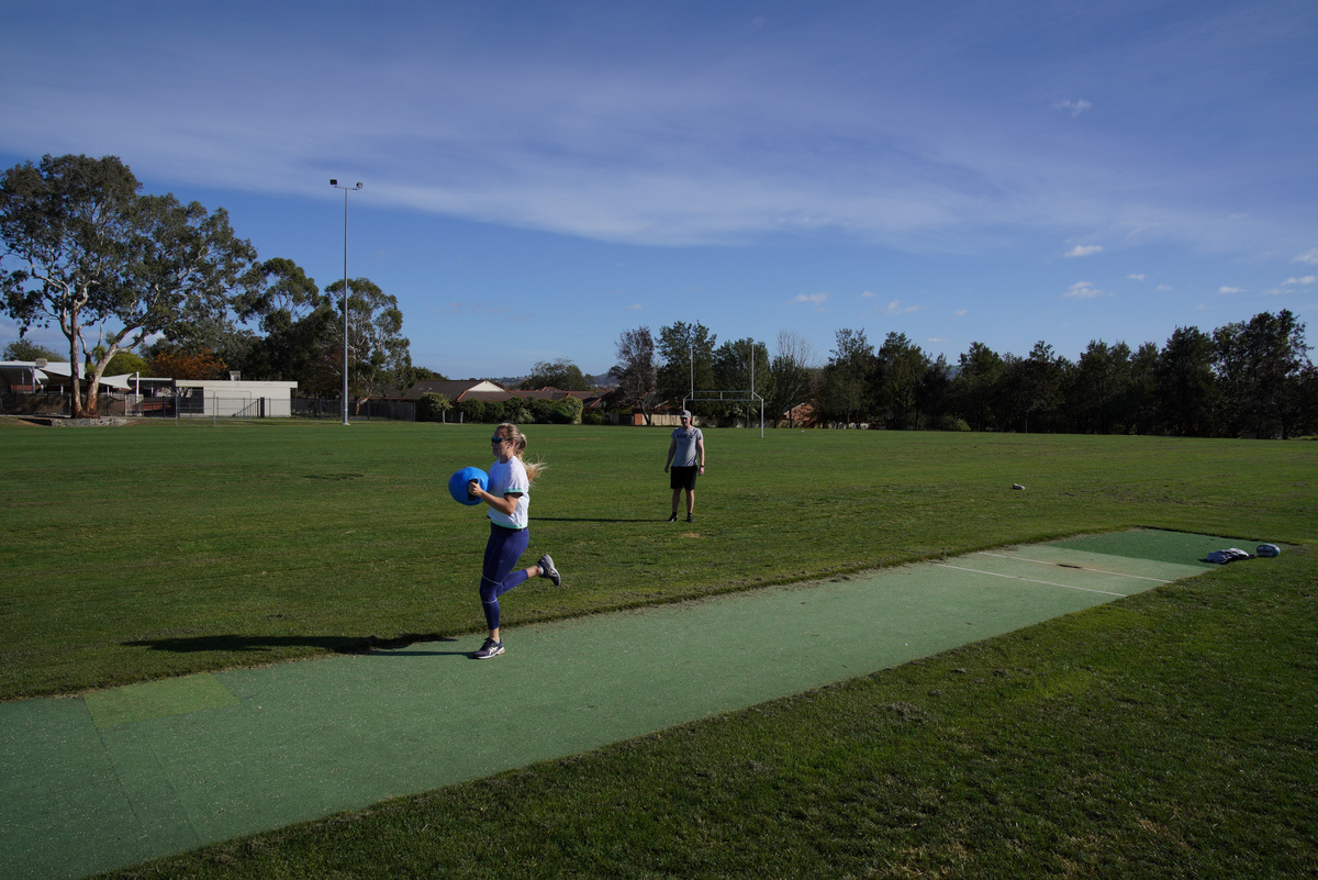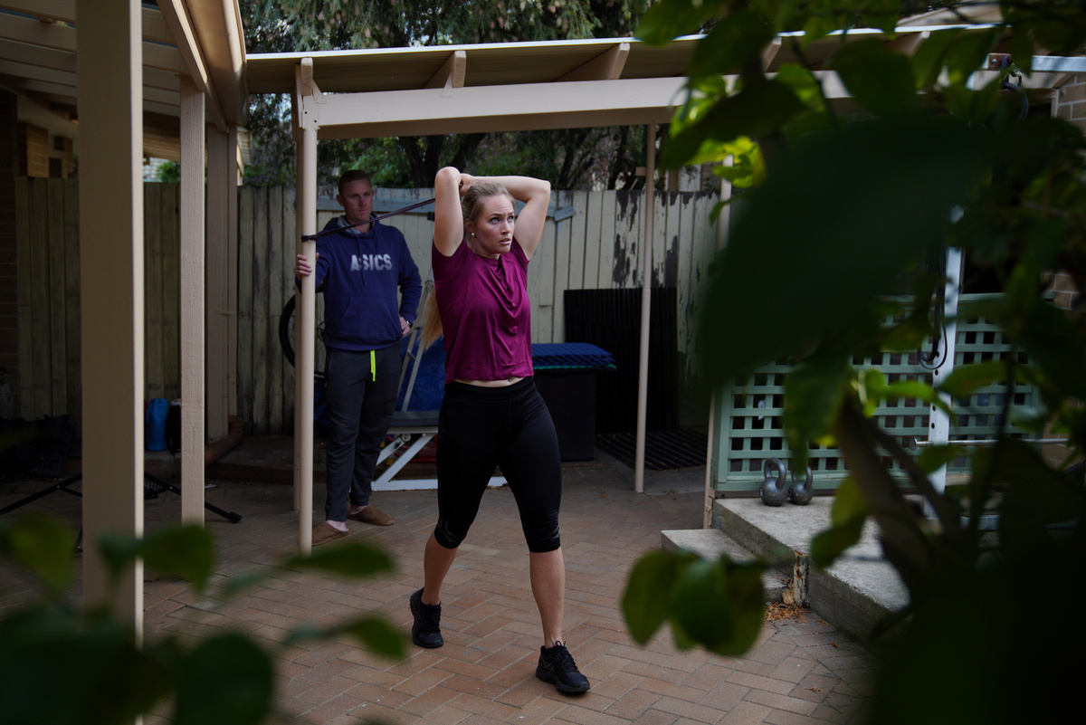 Javelin world champion Kelsey-Lee Barber works out at home with husband and coach Mike Barber, as the two continue preparations for the postponed Tokyo Olympic Games amidst the spread of the coronavirus disease (COVID-19), in Canberra, Australia, April 21, 2020. Picture taken April 21, 2020. REUTERS/Loren Elliott