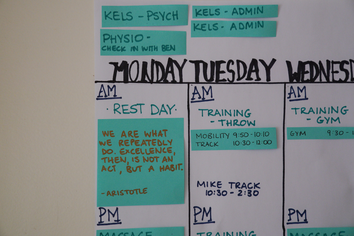 An inspirational quote is seen on a calendar inside the home of javelin world champion Kelsey-Lee Barber and her husband and coach Mike Barber, as the two continue preparations for the postponed Tokyo Olympic Games amidst the spread of the coronavirus disease (COVID-19), in Canberra, Australia, April 21, 2020. Picture taken April 21, 2020. REUTERS/Loren Elliott