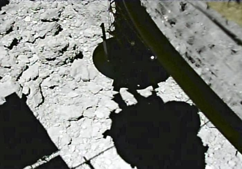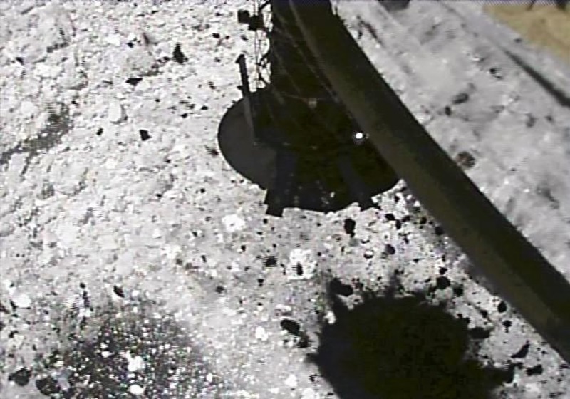 Hayabusa2 landed on the surface of Ryugu for several seconds on Feb. 22. A camera attached to the side of the probe showed a cylindrical sample-collection device making contact with the ground.
