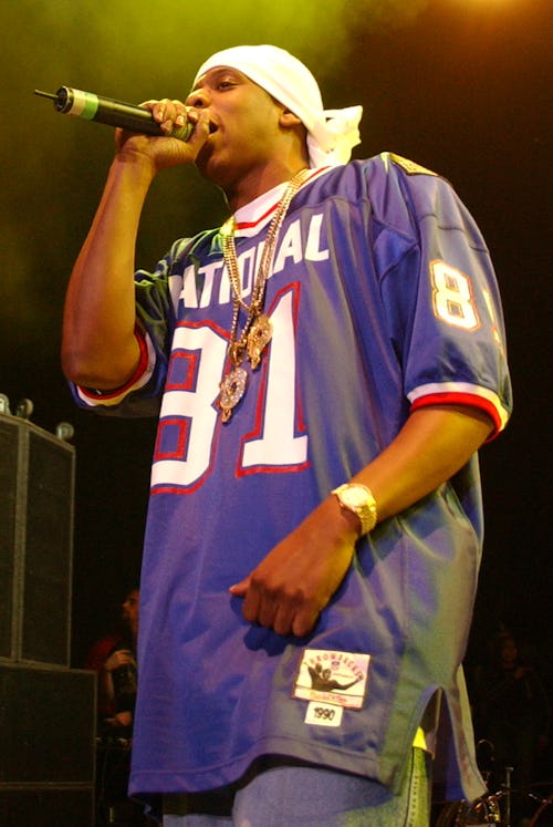 Jay-Z’s style has evolved as much as you’d expect from someone who’s been in the limelight for nearly 30 years, and his attitude toward jerseys can be traced through his lyrics. On 2001’s “Jigga That N****” he rapped “Come on the track like duh-du-duh-duh/With a throwback jersey and a fitted.” He then opted for a slightly more polished look in The Black Album era and on “What More Can I Say?” rapped, “And I don’t wear jerseys, I’m 30-plus/Give me a crisp pair of jeans, n****, button-ups.”