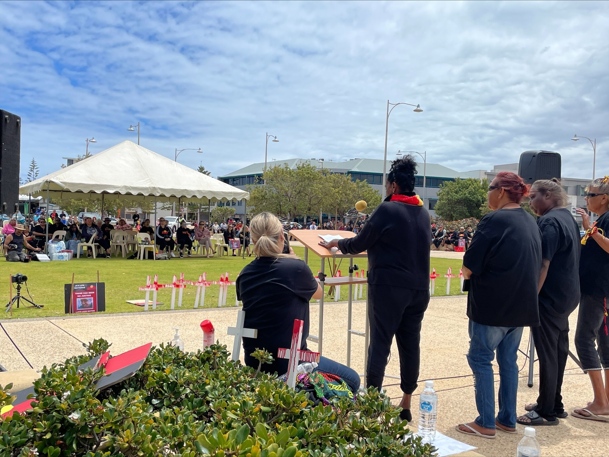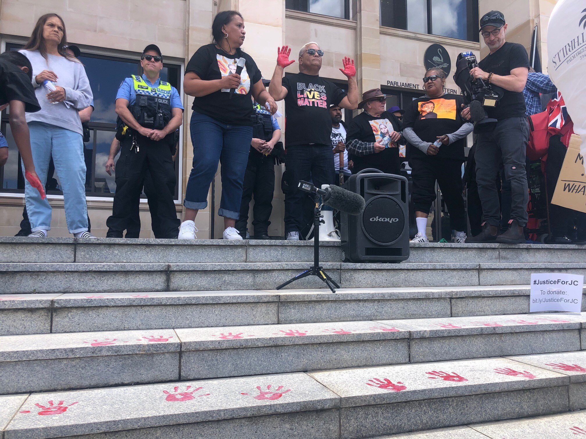 Relatives of JC were at the Perth rally with her sister, Bernadette Clarke, wiping away tears as she addressed the crowd.