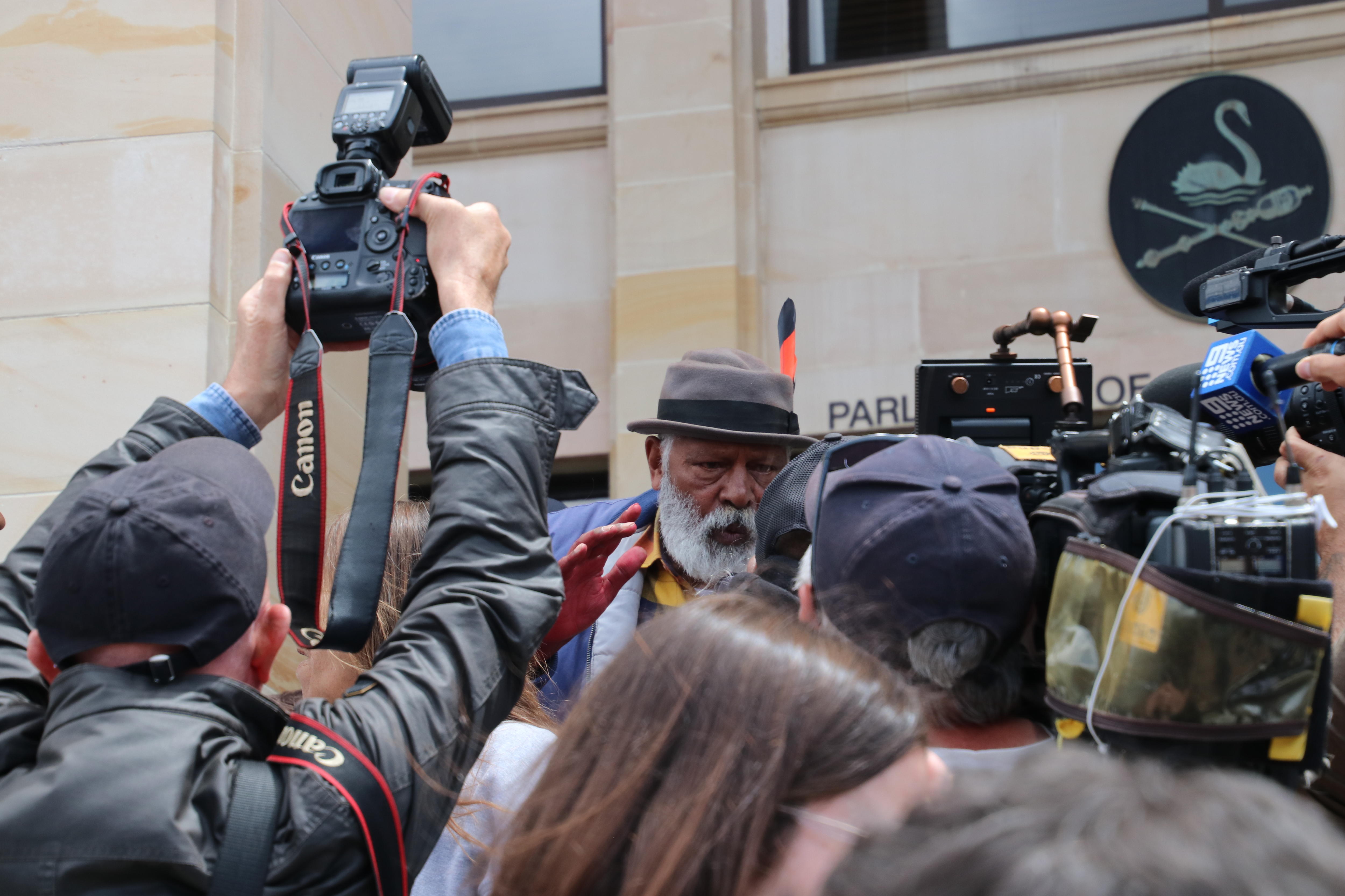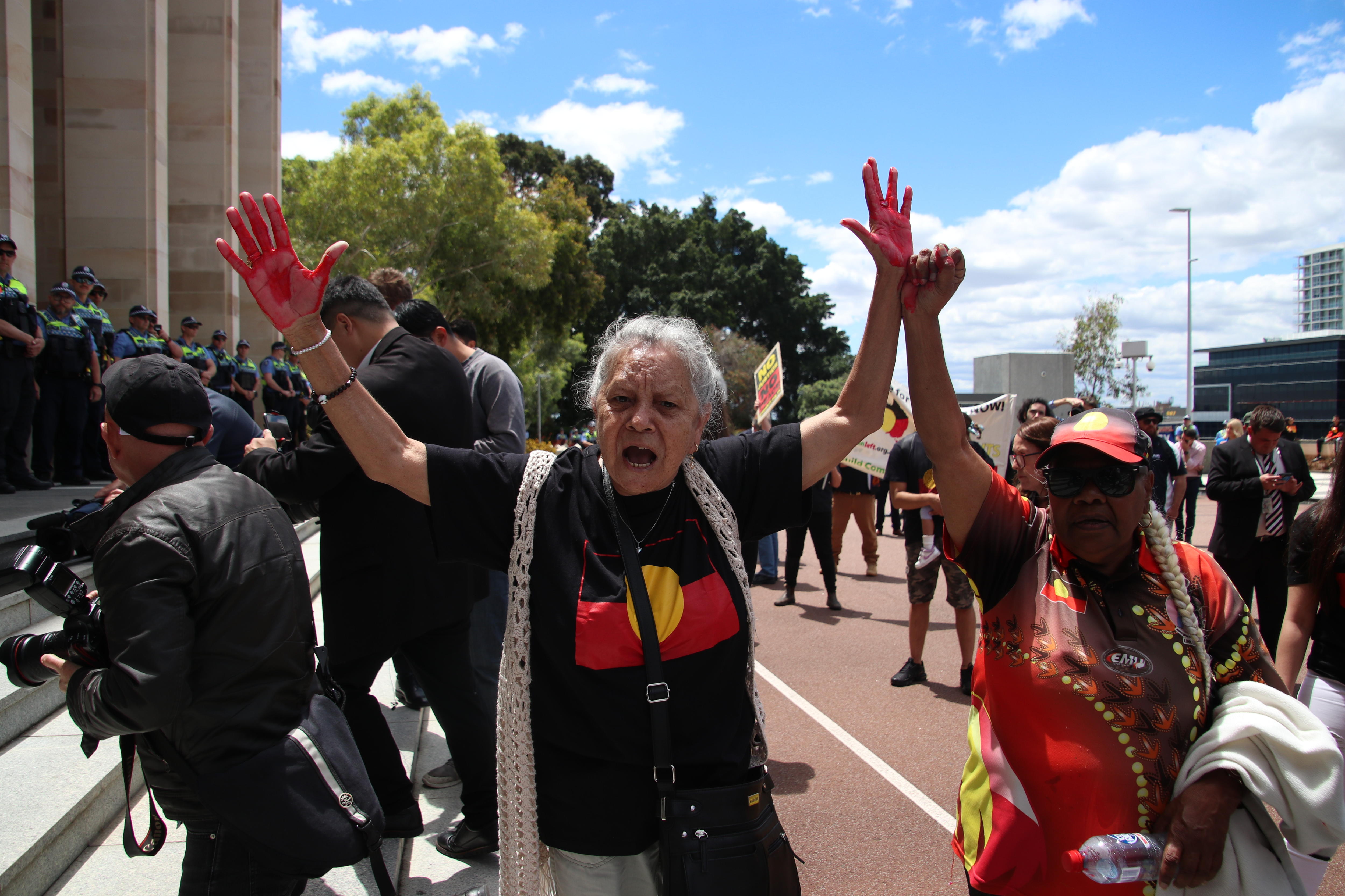 Mr Dingo later addressed the crowd, saying he was a Yamatji man who went to school in Geraldton and he had family at the rally today.