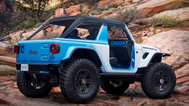 The idea is the same: A six-speed manual gearbox, electric and blue/white theme. Wrangler Magneto kicks things up a notch this year to deliver the kind of performance that forces drivers to “buckle up and grab with both hands,” as Jeep puts it.