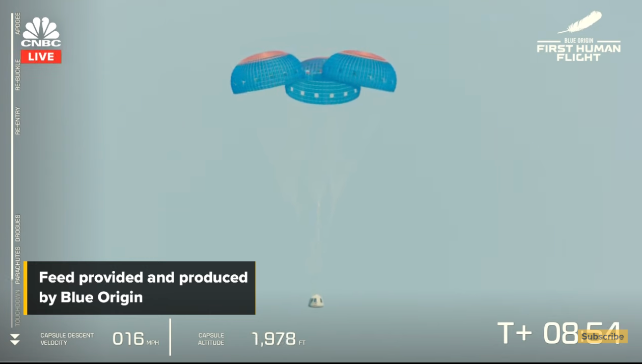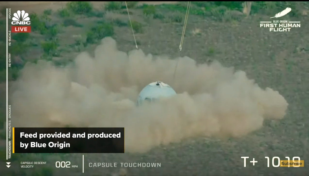About 11 minutes after launch, the New Shepard capsule landed on Earth, aided by parachutes.