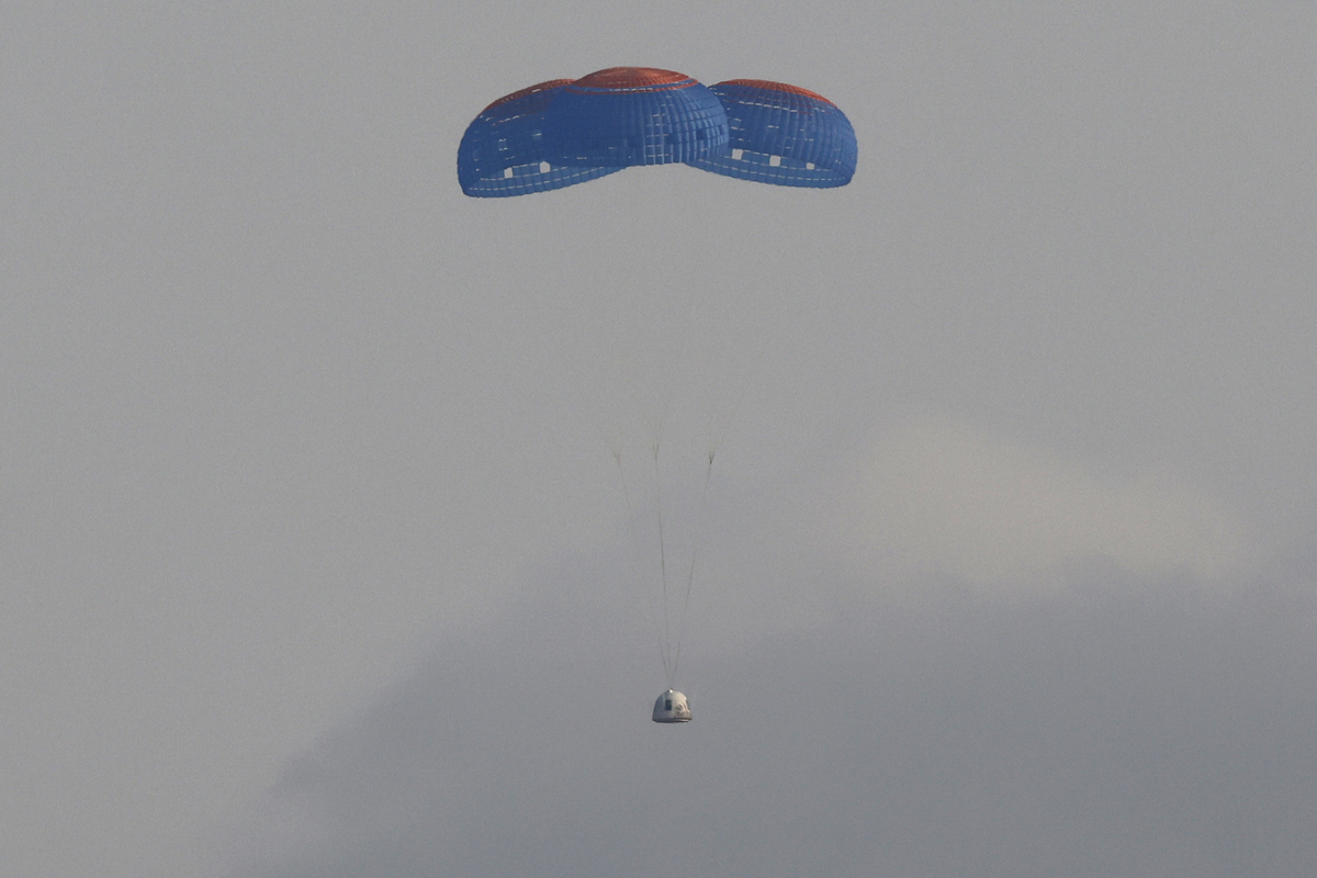 After the capsule separated from the booster, the crew unbuckled, performing back flips and tossing each other Skittles candy in weightlessness. The capsule then returned to Earth with parachutes, using a retro-thrust system expelling a "pillow of air" for a soft landing.