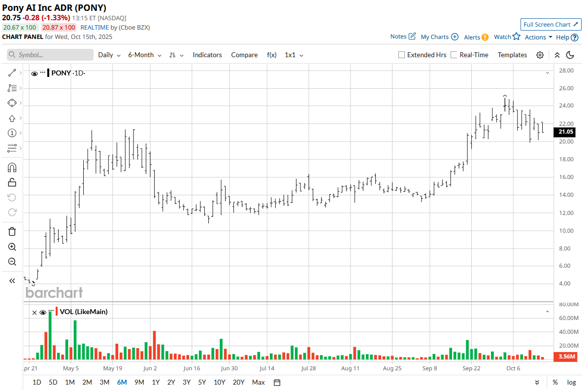 Pony AI (PONY) is a pioneering autonomous driving technology company. Specializing in the development and large-scale commercialization of autonomous mobility, Pony AI integrates proprietary software and hardware to offer robotaxi, robotruck, and autonomous vehicle solutions across major cities globally. The company has secured permits for fully driverless public services in Beijing, Guangzhou, Shanghai, and Shenzhen and has completed over 45 million kilometers of autonomous testing worldwide as of 2025.