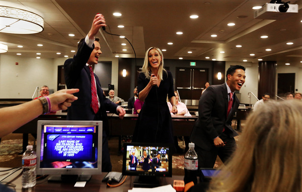 They then completed a 50-question quiz (they had eight seconds for each answer) before participating in a mock round of "Jeopardy!" Three at a time, just like on TV.