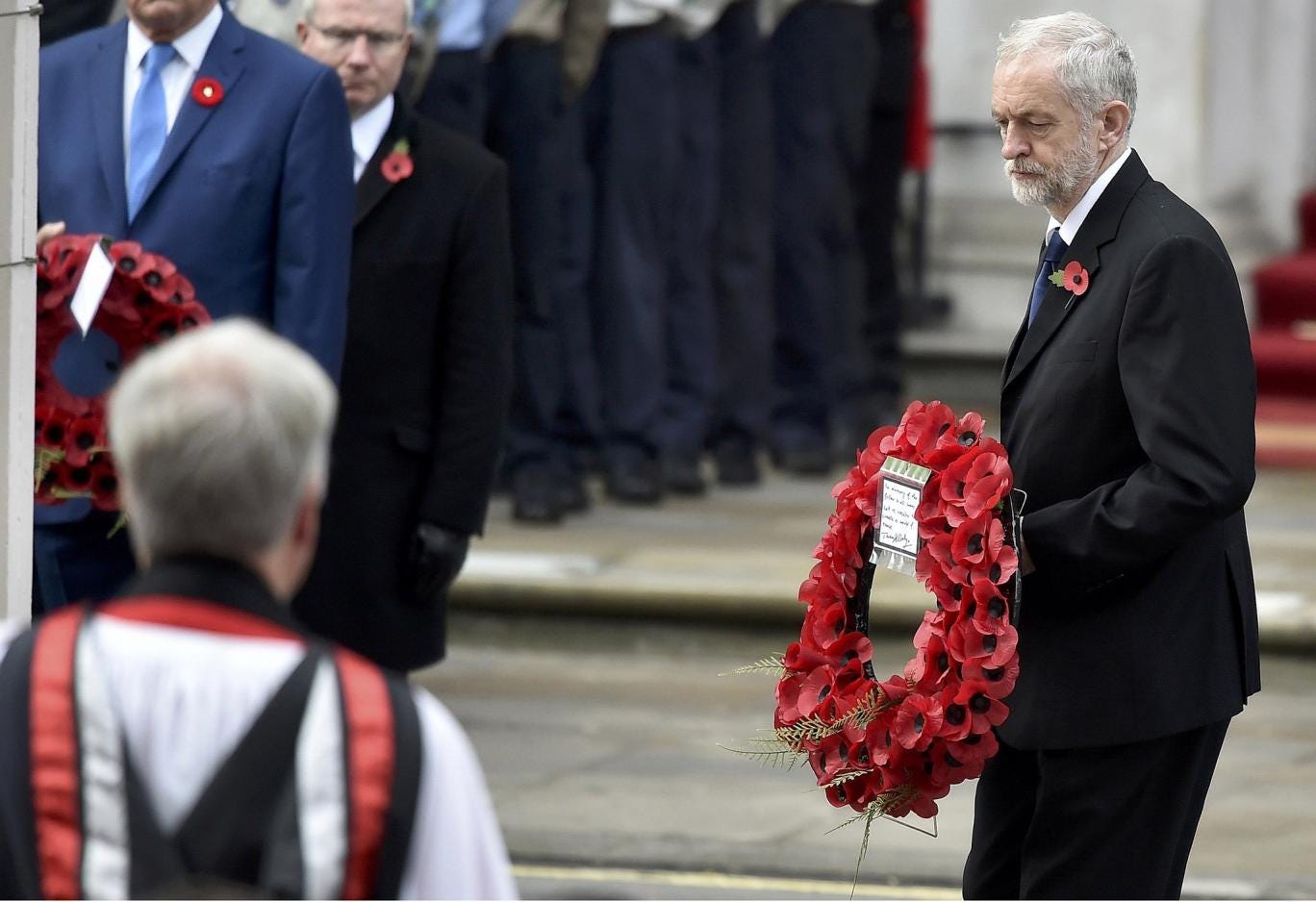 There had been speculation in the past few weeks about whether Mr Corbyn, a lifelong pacifist, would wear a red poppy to the ceremonies. In the past he has chosen to wear a white poppy alongside the red one, which symbolises the belief that there are better ways of resolving conflicts than war.