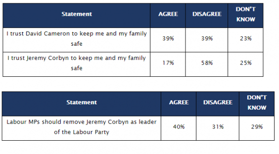 After Mr Corbyn appeared reluctant to say he would order British police to shoot to kill if faced with a terrorist attack similar to that in Paris, the public are twice as likely to say they trust David Cameron to keep them and their family safe (39 per cent) as they are to say they trust Mr Corbyn (17 per cent).