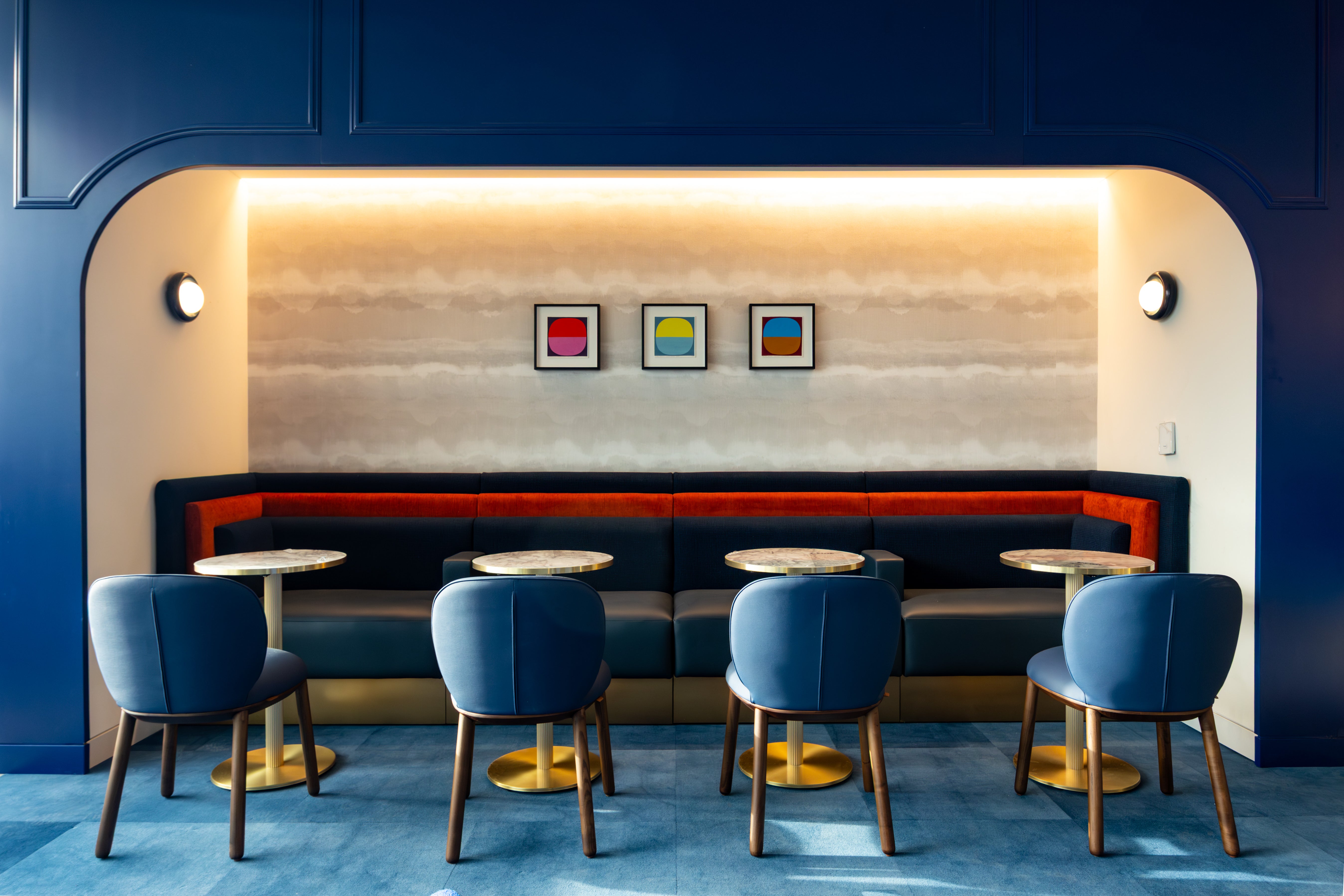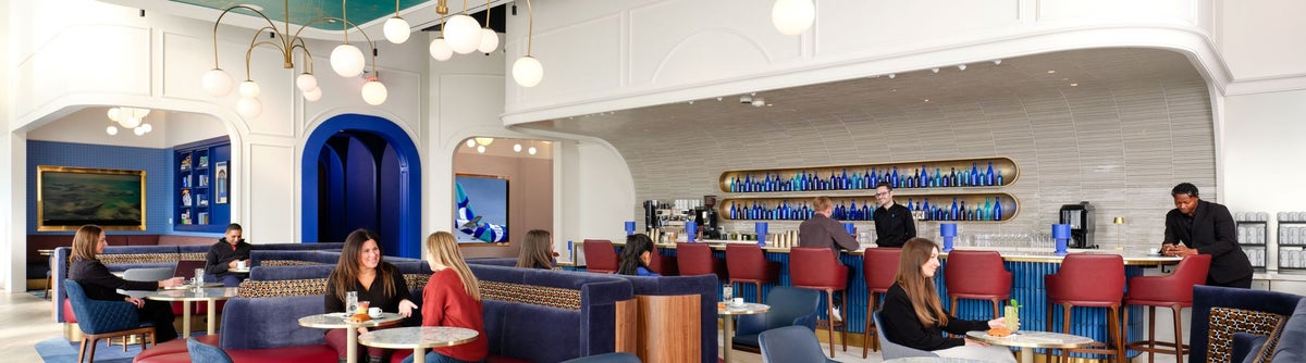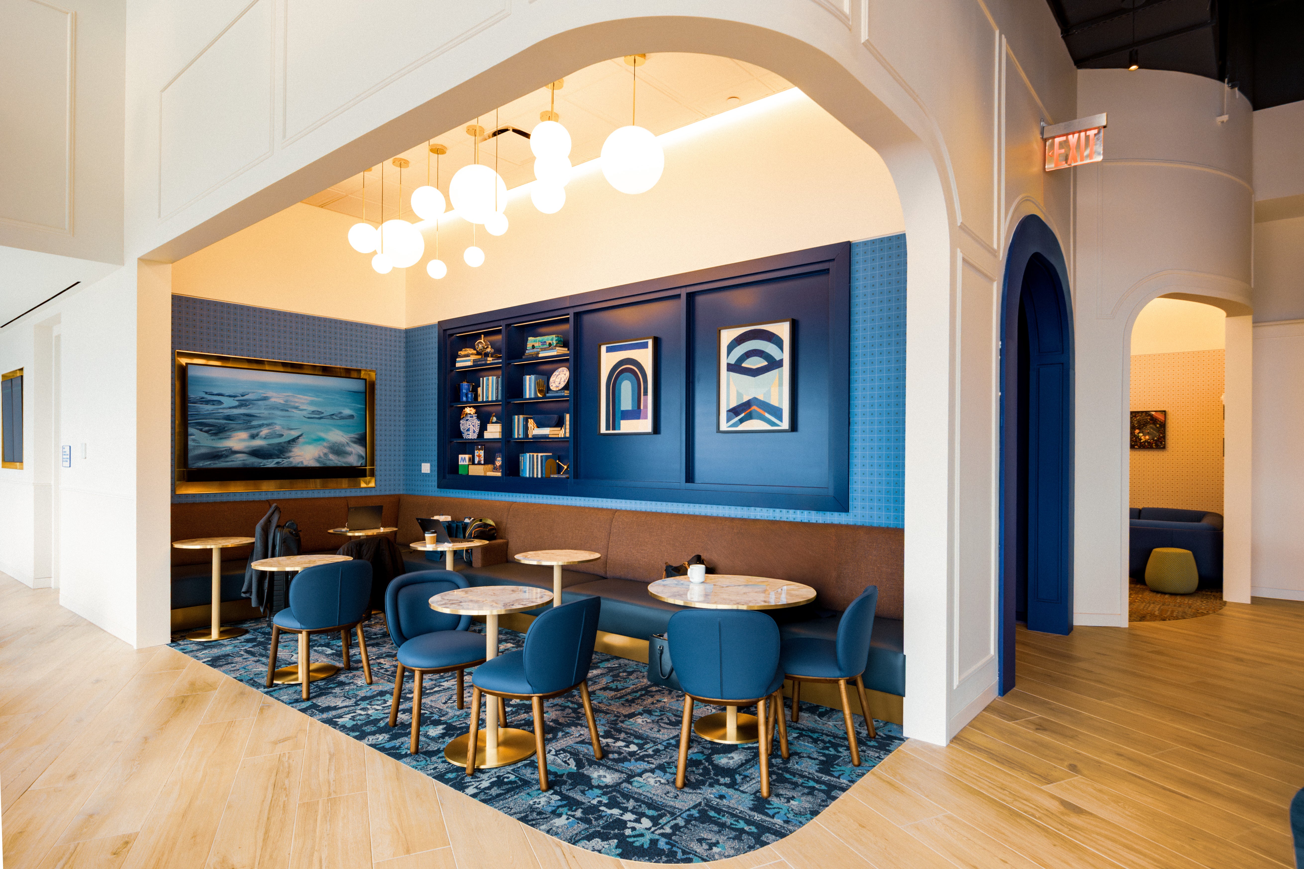 Design highlights include a lobby-style entrance, brass accents and a mural designed by Artists for Humanity that features constellations of JetBlue destinations in the style of Grand Central Terminal’s iconic celestial ceiling.