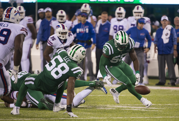 Wilkerson also batted down a pass on a crucial second down in the third quarter. The Jets forced three fumbles and recovered them all, including a Jordan Jenkins strip sack with 11:26 left in the fourth quarter, setting Josh McCown and the offense up at the Bills' five-yard line. Forte walked into the end zone on the next play for his second touchdown, putting the finishing touches on his stellar day.