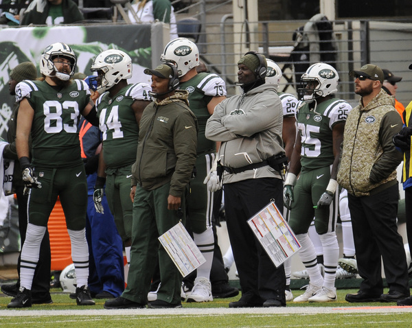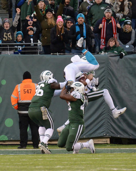 They took that two-point advantage on a 19-yard Chandler Catanzaro field goal early in the fourth quarter. The Jets had three tries to punch the ball in from the one-yard line, but offensive coordinator John Morton called three passing plays. On one of them, tight end Austin Seferian-Jenkins hauled in a catch on a fade route. The play was originally ruled a touchdown, but the referees overturned the call on replay.