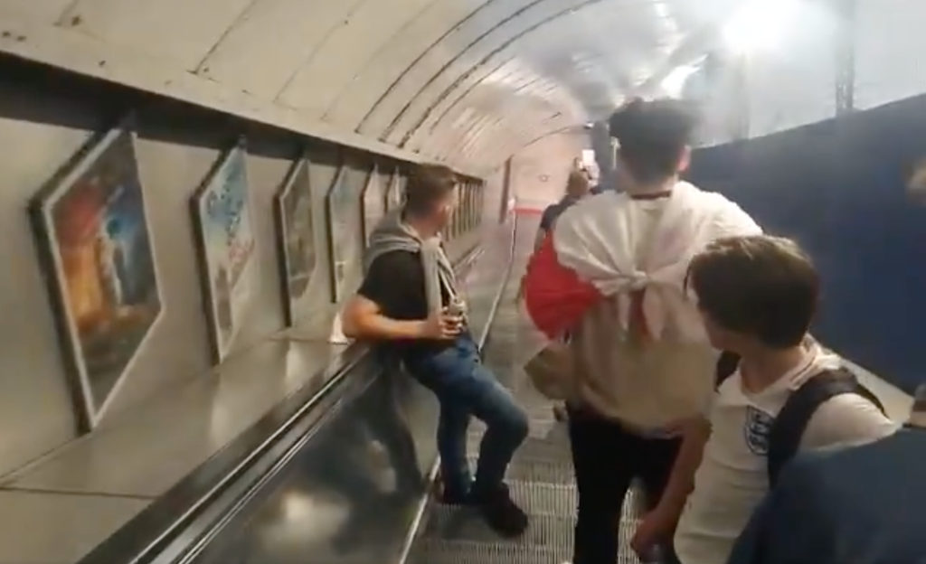 A second clip as posted on social media showed the group going down an escalator at a Tube station in London before turning around and appearing to abuse people behind them.