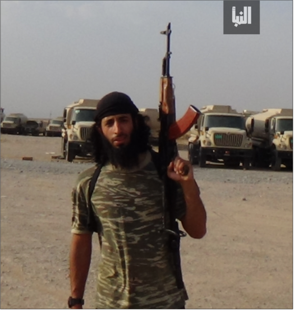 The images show Emwazi with a full beard and bandana. He wears battle dress and is equipped with a Kalashnikov rifle.