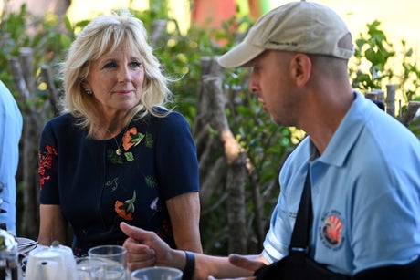The first lady spent just under an hour talking with about eight people, including a young girl, as they sat at a picnic table outside a contemporary art gallery overlooking Mount's Bay. Her husband, President Joe Biden attended the Group of Seven world leaders summit that is taking place elsewhere in southwest England.